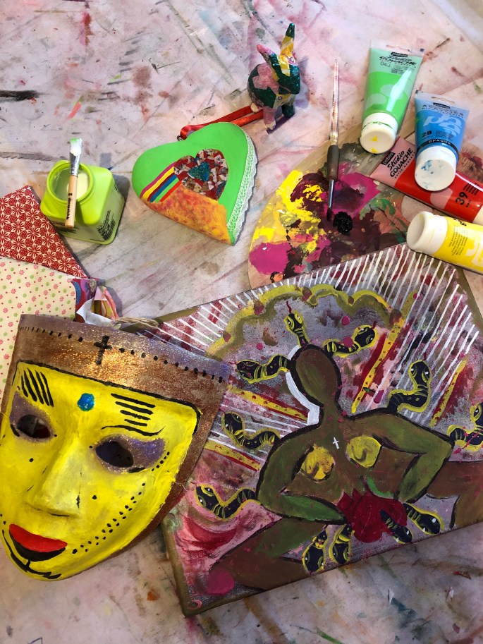 L’atelier individuel permet donc d’extérioriser ce qu’il y a à l’intérieur. Dans cette pratique, ce ne sont pas les mots qui sont au centre du processus mais l’action de créer, le fait d’être en mouvement. La vie d’ailleurs n’est que mouvement, on sait bien que ce qui est figé meurt. Alors voilà, on remet de la Vie dans des endroits cristallisés car on sait qu’être au plus près de soi-même est un chemin. Et alors, la transformation s’opère malgré nous, à l’issue de notre propre volonté égotique. Et c’est bien en cela que cette pratique est si intéressante.